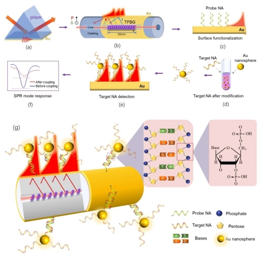 球友会网页版-球友会(中国)官方,先进光学与光纤传感技术团队的彭伟教授和张扬副教授与中国计量大学合作,联合通信作者身份在最新一期Biosensors and Bioelectronics(影响因子IF=12.6)上发表论文,介绍了一种基于倾斜光纤布拉格光栅(TFBG)的超灵敏核酸检测系统。该传感系统基于一种无标签光纤表面等离子共振(SPR)的生物传感器,相较于公认的Kretschmann-Raether棱镜等体棱镜结构,具备更低成本、小型化及临床快速检测应用(POCT)的优势。在这一传感系统中,TFBG发射的包层模式在光纤包层上的薄金涂层中诱导表面等离子体共振,实现了对NA的超灵敏检测和超低限的检测能力。该技术突破了传统无标记光纤生化NA传感的极限,实现了从aM到pM(10^-18到10^-12M)的大动态检测范围,以及10^-18M最低检测限(LOD),是目前报道的光纤核酸检测传感器中最低的检测极限。