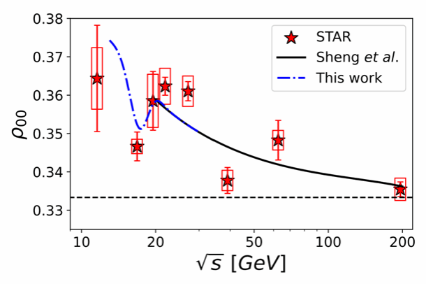 图3. 根据该研究理论分析给出的临界现象对ϕ介子自旋排列贡献的示意图(蓝色虚线)。黑色实线和实验数据分别来自[X.-L. Sheng, L. Oliva, Z.-T. Liang, Q. Wang, and X.-N. Wang, Phys. Rev. Lett. 131, 042304 (2023)]与[STAR, Nature 614, 244 (2023)]