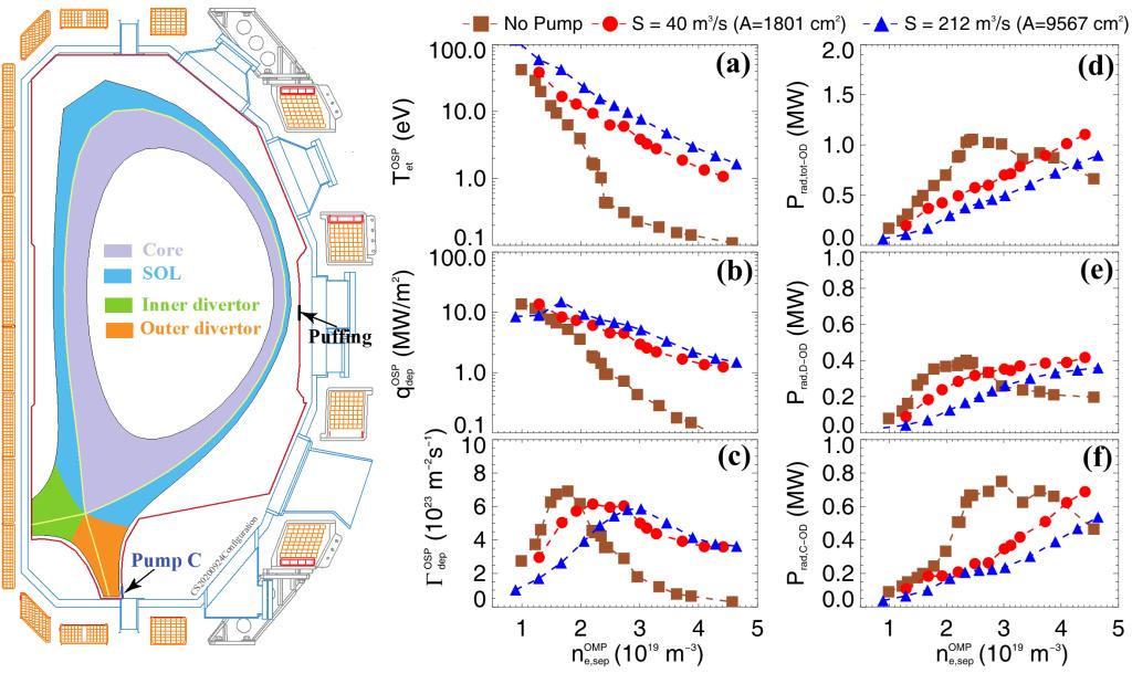 针对粒子控制需求,桑超峰教授开展了封闭偏滤器抽气研究。发现抽气会显著提高等离子体脱靶阈值,抽气口位置对等离子体的影响本质在于有效粒子排除。抽气口距离打击点越近,有效粒子排除越高。该研究对于先进偏滤器中抽气口位置和抽气速率的选取具有重要意义。近日,此研究成果以题为《The role of divertor pumping in plasma detachment and particle exhaust in a closed divertor》发表在《Nuclear Fusion》上。该系列研究对于未来聚变堆的能量和粒子控制、等离子体长时间稳态运行具有重要价值。