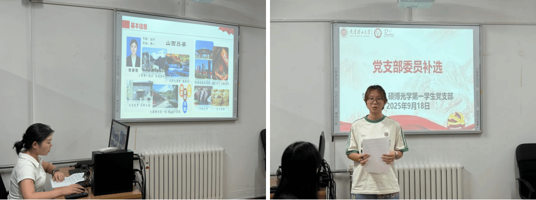 会议第二项,进行党支部委员补选。由于匡凯丽同志即将卸任,现党支部委员会空缺宣传委员1名,根据上级党委批复和大会日程安排,现进行补选。首先由党支部书记吕拓同志宣读补选办法,接下来由候选人樊睿智同志和赵雯博同志介绍各自基本情况,最后通过无记名投票的方式,确定樊睿智同志当选为物理学院硕博光学第一学生党支部宣传委员。