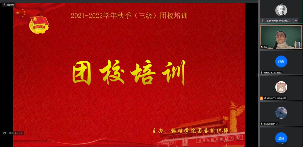 2021年11月28日晚,物理学院三级团校培训采用线上形式顺利召开。参加本次会议的有物理学院团委书记、20级队辅导员纪丹红老师,物理学院团委副书记、21级队辅导员陈万年老师,校学生会熊天成同学,校团委朴舒梵同学、汪不凡同学,理论学习中心的吴海欣同学及物理学院团学所有成员。